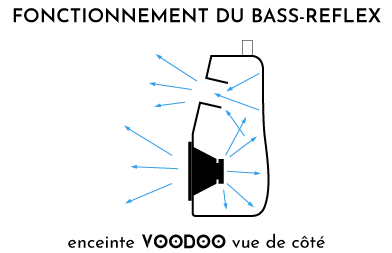 L’enceinte autonome VOODOO utilise le système Bass Reflex. On a donc affaire à des basses amplifiées naturellement et non pas par traitement du signal sonore.